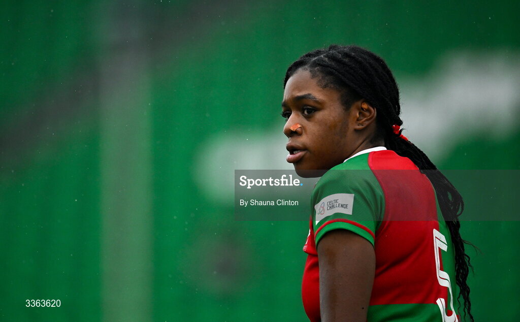 21 February 2026; Faith Oviawe of Clovers during the Celtic Challenge Round 8 match between Clovers and Edinburgh Rugby at Dexcom Stadium in Galway. Photo by Shauna Clinton/Sportsfile