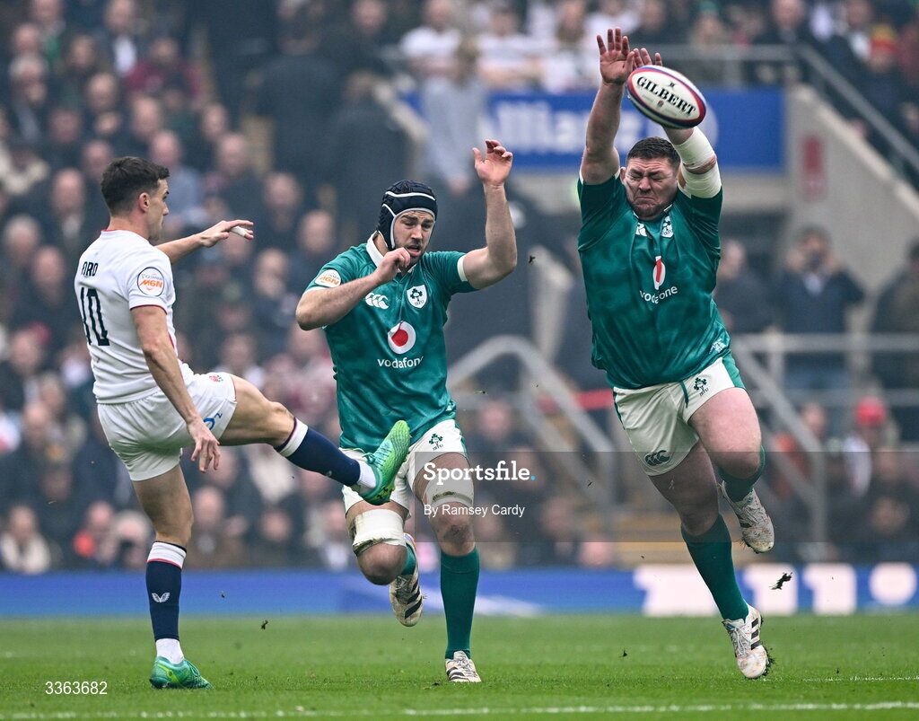 21 February 2026; Ireland players Tadhg Furlong, right, and Caelan Doris attempt to charge down England's George Ford during the Guinness 6 Nations Rugby Championship match between England and Ireland at the Allianz Stadium in Twickenham, England. Photo by Ramsey Cardy/Sportsfile