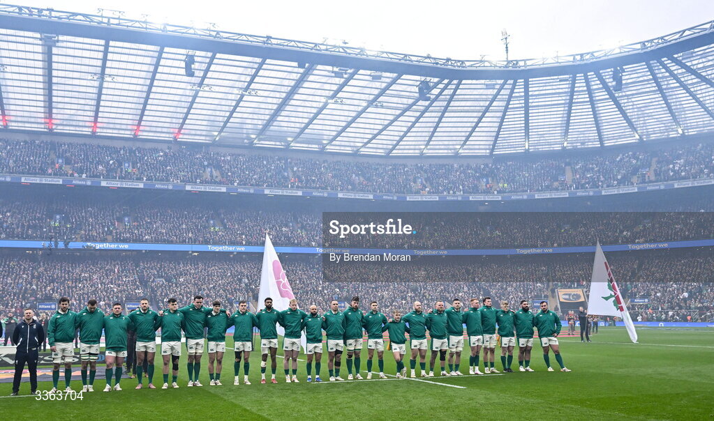 21 February 2026; Ireland players during the anthems before the Guinness 6 Nations Rugby Championship match between England and Ireland at the Allianz Stadium in Twickenham, England. Photo by Brendan Moran/Sportsfile