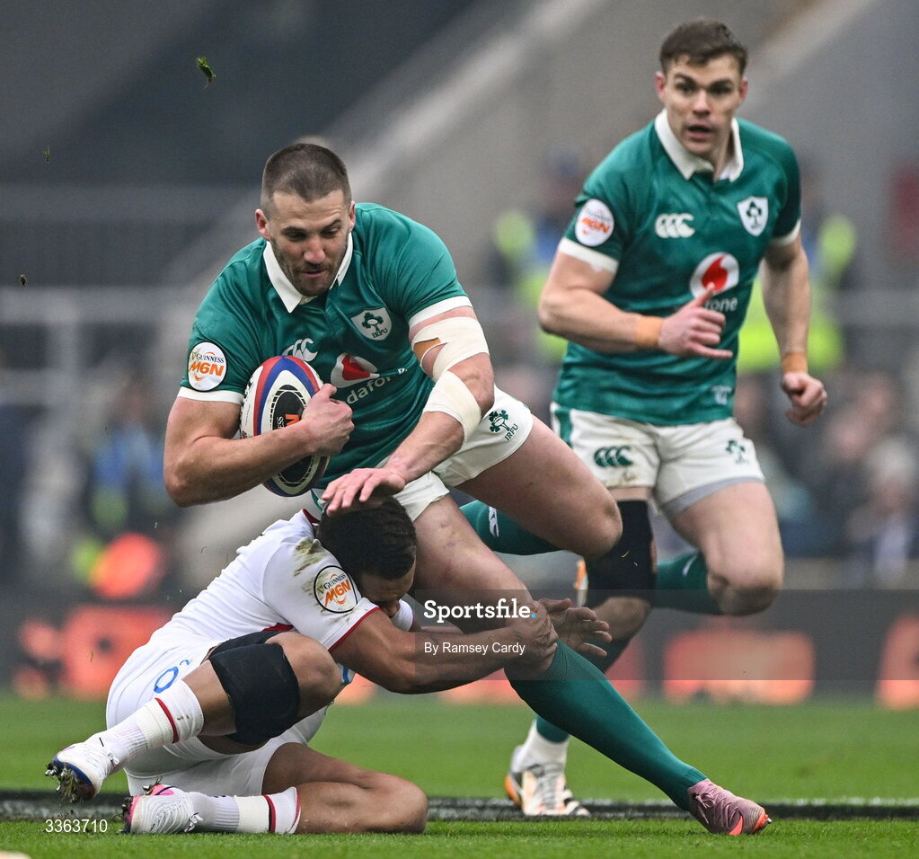 21 February 2026; Stuart McCloskey of Ireland is tackled by Ollie Lawrence of England during the Guinness 6 Nations Rugby Championship match between England and Ireland at the Allianz Stadium in Twickenham, England. Photo by Ramsey Cardy/Sportsfile