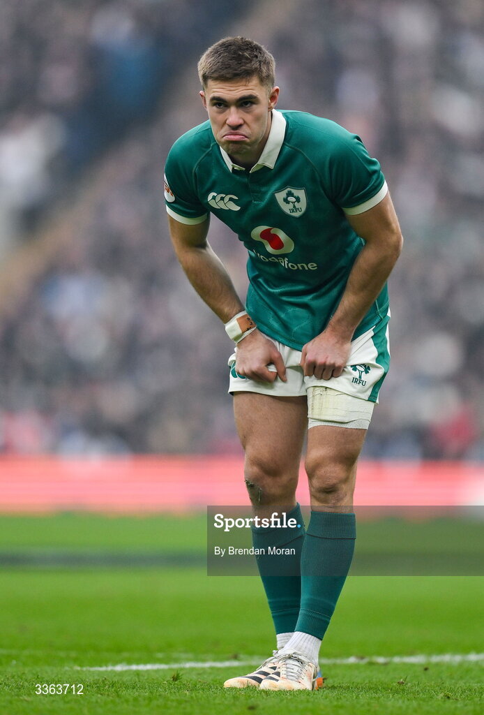 21 February 2026; Jack Crowley of Ireland during the Guinness 6 Nations Rugby Championship match between England and Ireland at the Allianz Stadium in Twickenham, England. Photo by Brendan Moran/Sportsfile