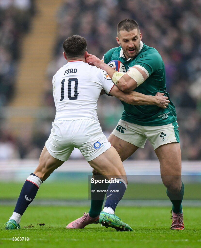 21 February 2026; Stuart McCloskey of Ireland is tackled by George Ford of England during the Guinness 6 Nations Rugby Championship match between England and Ireland at the Allianz Stadium in Twickenham, England. Photo by Brendan Moran/Sportsfile