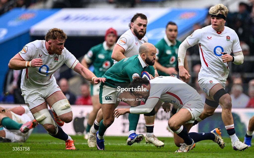 21 February 2026; Jamison Gibson-Park of Ireland is tackled by Alex Mitchell of England during the Guinness 6 Nations Rugby Championship match between England and Ireland at the Allianz Stadium in Twickenham, England. Photo by Ramsey Cardy/Sportsfile