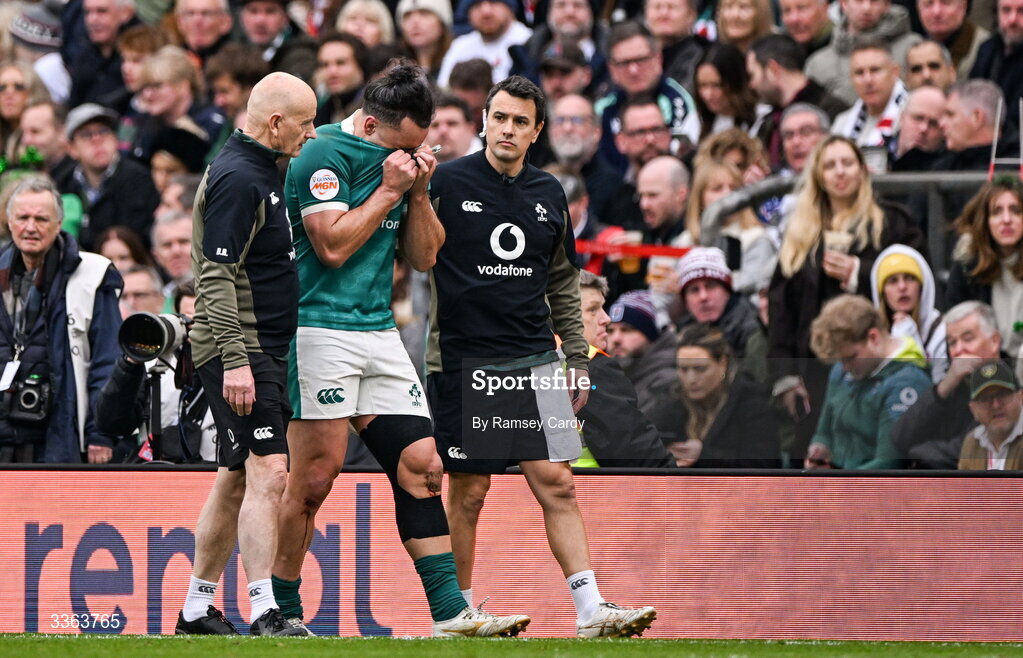 21 February 2026; James Lowe of Ireland leaves the pitch to receive medical attention during the Guinness 6 Nations Rugby Championship match between England and Ireland at the Allianz Stadium in Twickenham, England. Photo by Ramsey Cardy/Sportsfile