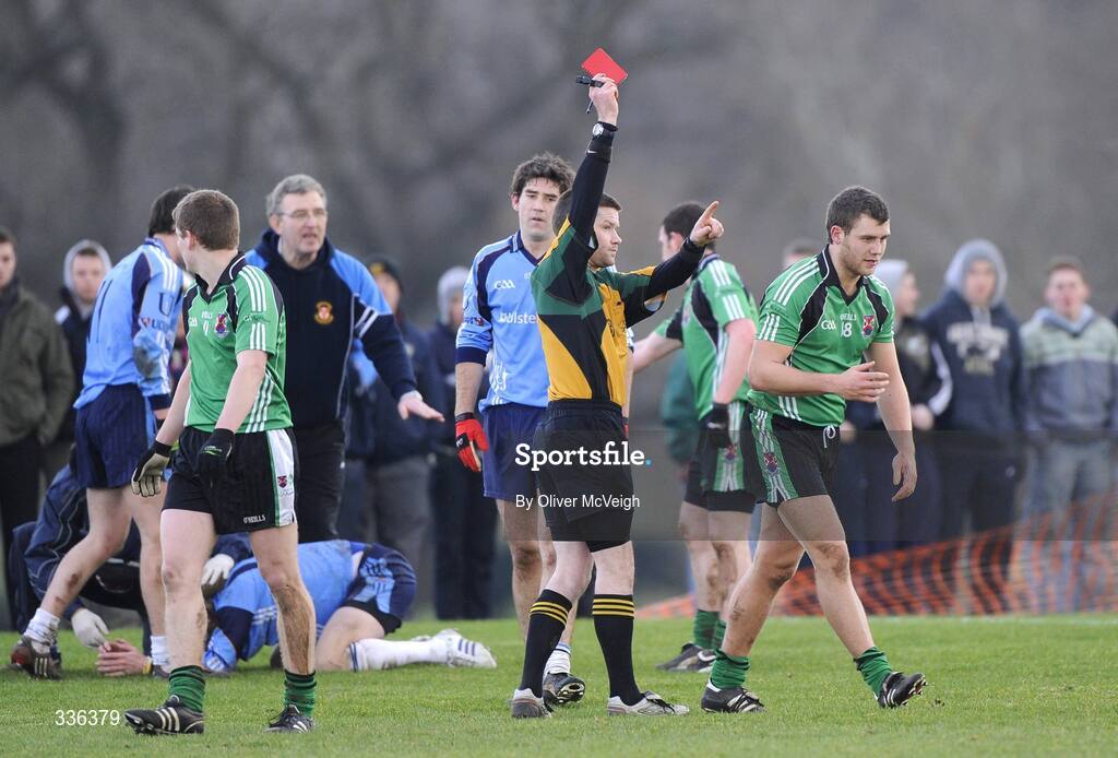 4 February 2009; Referee Pauric Hughes issues Paul Courtney, Queen's University, a straight red card for a second half incident. Sigerson Cup, Queen's University v University of Ulster Jordanstown, The Dub, Belfast. Picture credit: Oliver McVeigh / SPORTSFILE