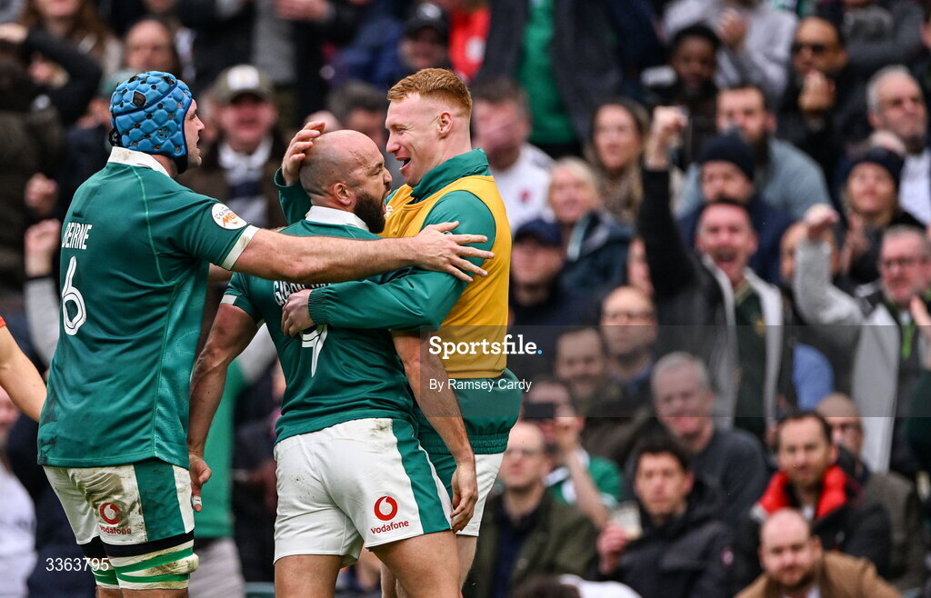 21 February 2026; Jamison Gibson-Park of Ireland, centre, celebrates with teammates Ciarán Frawley, right, and Tadhg Beirne after scoring their side's first try during the Guinness 6 Nations Rugby Championship match between England and Ireland at the Allianz Stadium in Twickenham, England. Photo by Ramsey Cardy/Sportsfile