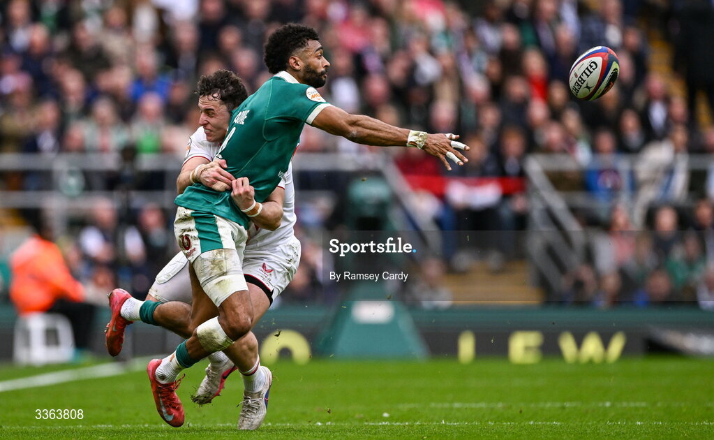 21 February 2026; Robert Baloucoune of Ireland is tackled by Henry Arundell of England during the Guinness 6 Nations Rugby Championship match between England and Ireland at the Allianz Stadium in Twickenham, England. Photo by Ramsey Cardy/Sportsfile