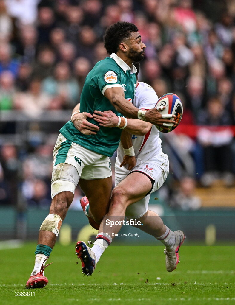 21 February 2026; Robert Baloucoune of Ireland is tackled by Henry Arundell of England during the Guinness 6 Nations Rugby Championship match between England and Ireland at the Allianz Stadium in Twickenham, England. Photo by Ramsey Cardy/Sportsfile