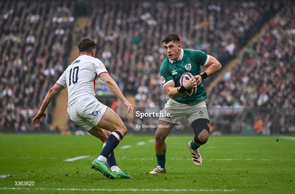 21 February 2026; Dan Sheehan of Ireland in action against George Ford of England during the Guinness 6 Nations Rugby Championship match between England and Ireland at the Allianz Stadium in Twickenham, England. Photo by Brendan Moran/Sportsfile