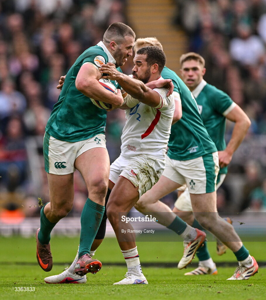 21 February 2026; Stuart McCloskey of Ireland is tackled by Fraser Dingwall of England during the Guinness 6 Nations Rugby Championship match between England and Ireland at the Allianz Stadium in Twickenham, England. Photo by Ramsey Cardy/Sportsfile