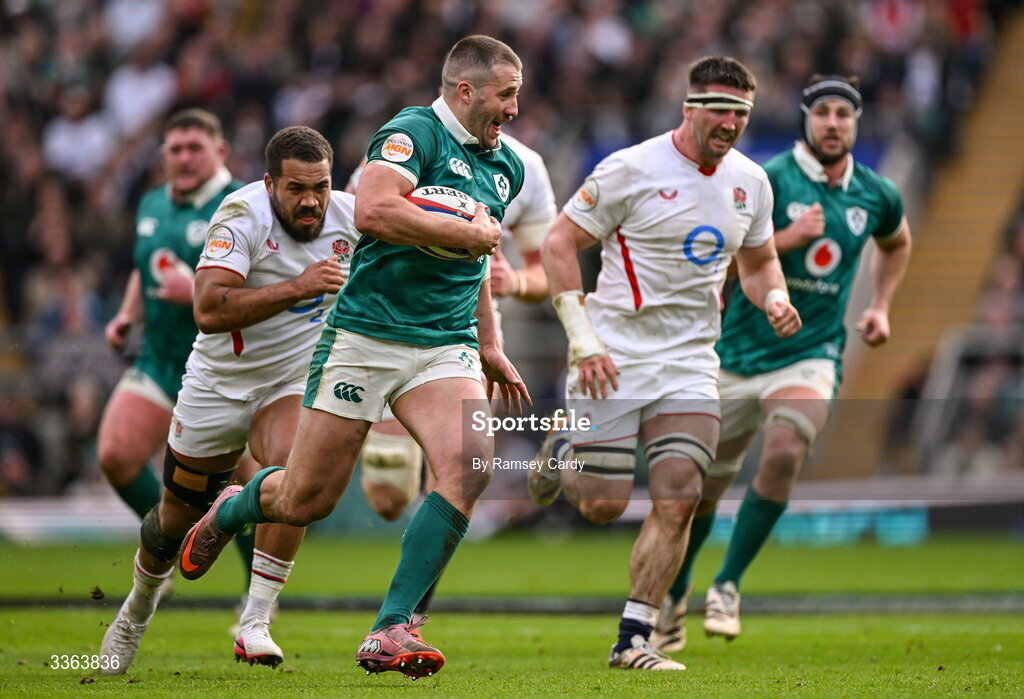 21 February 2026; Stuart McCloskey of Ireland makes a break during the Guinness 6 Nations Rugby Championship match between England and Ireland at the Allianz Stadium in Twickenham, England. Photo by Ramsey Cardy/Sportsfile