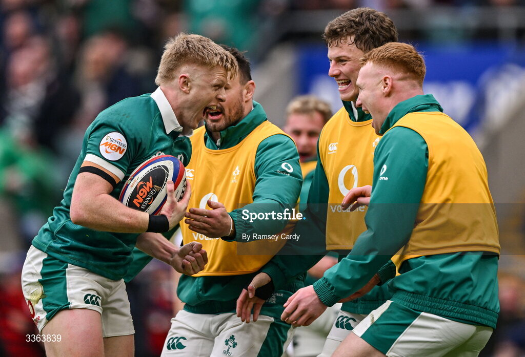 21 February 2026; Tommy O'Brien of Ireland, left, celebrates with teammates, from left, Rónan Kelleher, Cian Prendergast and Ciarán Frawley after scoring their side's third try during the Guinness 6 Nations Rugby Championship match between England and Ireland at the Allianz Stadium in Twickenham, England. Photo by Ramsey Cardy/Sportsfile