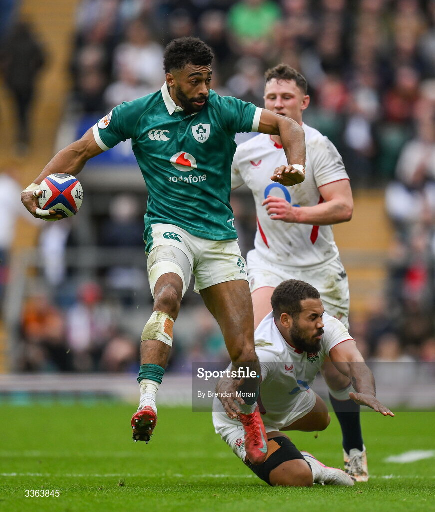 21 February 2026; Robert Baloucoune of Ireland evades the tackle of England's Ollie Lawrence, before assisting his side's third try, during the Guinness 6 Nations Rugby Championship match between England and Ireland at the Allianz Stadium in Twickenham, England. Photo by Brendan Moran/Sportsfile