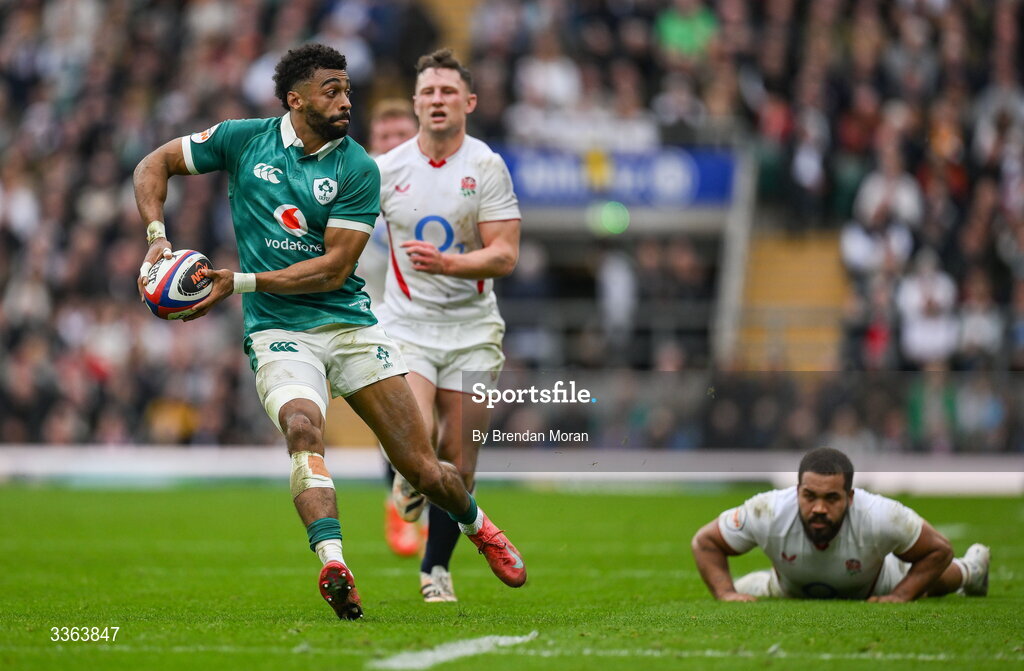 21 February 2026; Robert Baloucoune of Ireland evades the tackle of England's Ollie Lawrence, right, before assisting his side's third try, during the Guinness 6 Nations Rugby Championship match between England and Ireland at the Allianz Stadium in Twickenham, England. Photo by Brendan Moran/Sportsfile