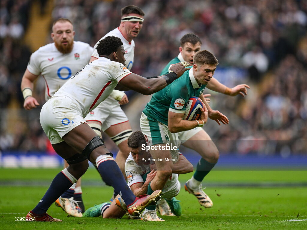 21 February 2026; Jack Crowley of Ireland is tackled by England players George Ford and Maro Itoje during the Guinness 6 Nations Rugby Championship match between England and Ireland at the Allianz Stadium in Twickenham, England. Photo by Brendan Moran/Sportsfile