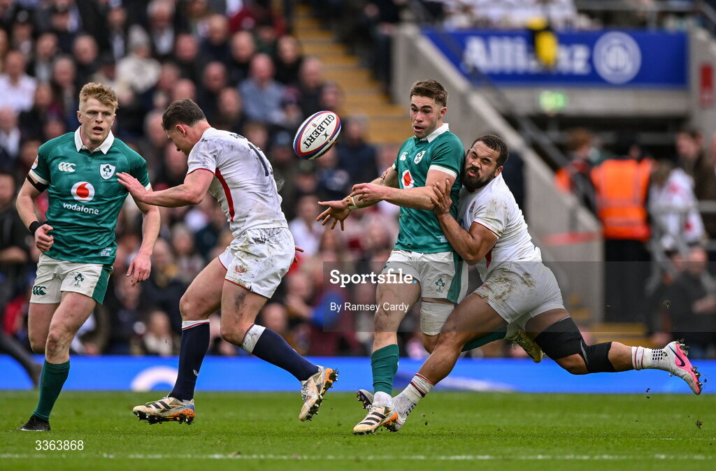 21 February 2026; Jack Crowley of Ireland is tackled by Fraser Dingwall of England during the Guinness 6 Nations Rugby Championship match between England and Ireland at the Allianz Stadium in Twickenham, England. Photo by Ramsey Cardy/Sportsfile