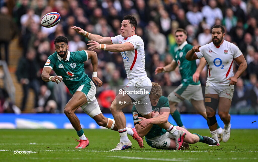 21 February 2026; Henry Arundell of England is tackled by Tommy O'Brien of Ireland during the Guinness 6 Nations Rugby Championship match between England and Ireland at the Allianz Stadium in Twickenham, England. Photo by Ramsey Cardy/Sportsfile