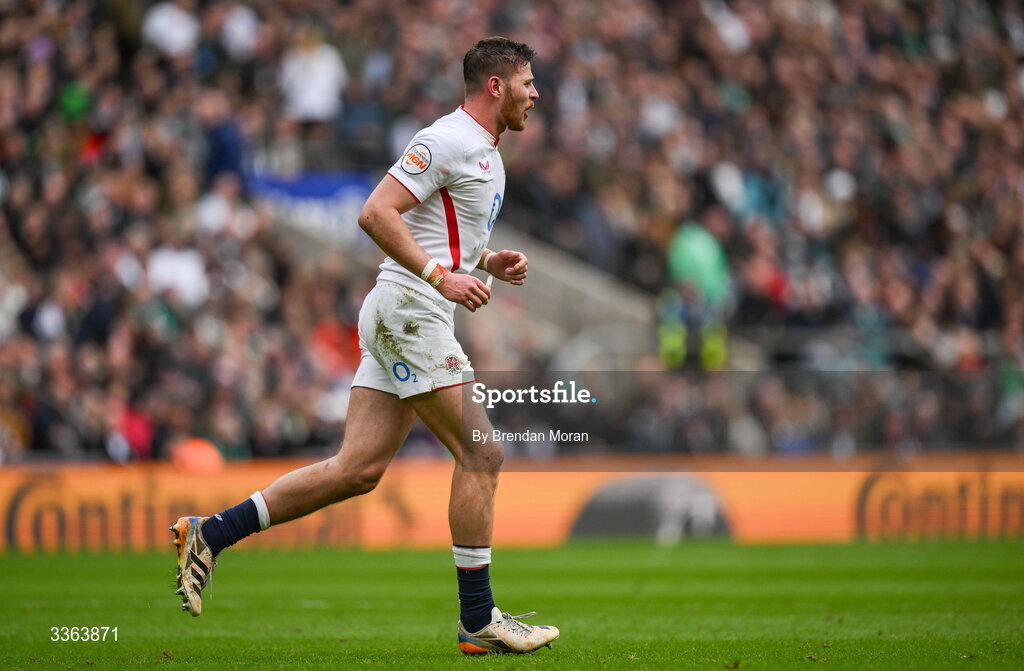 21 February 2026; Freddie Steward of England leaves the pitch after being shown a yellow card during the Guinness 6 Nations Rugby Championship match between England and Ireland at the Allianz Stadium in Twickenham, England. Photo by Brendan Moran/Sportsfile