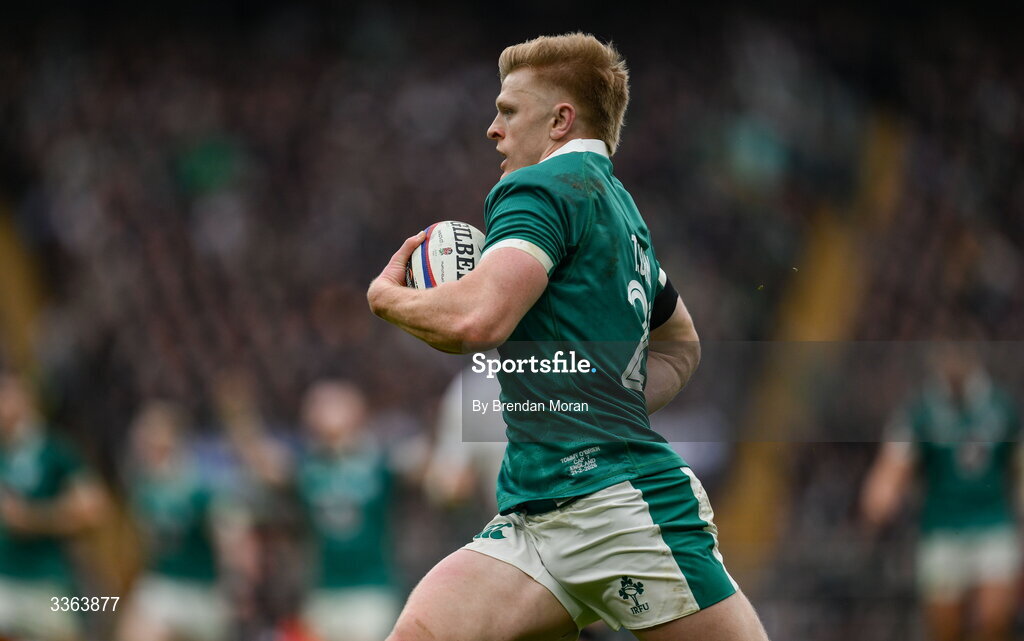 21 February 2026; Tommy O'Brien of Ireland on his way to scoring his side's third try during the Guinness 6 Nations Rugby Championship match between England and Ireland at the Allianz Stadium in Twickenham, England. Photo by Brendan Moran/Sportsfile