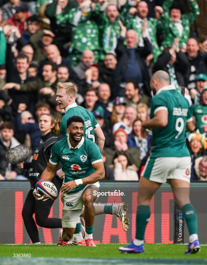 21 February 2026; Robert Baloucoune of Ireland after scoring his side's second try during the Guinness 6 Nations Rugby Championship match between England and Ireland at the Allianz Stadium in Twickenham, England. Photo by Brendan Moran/Sportsfile