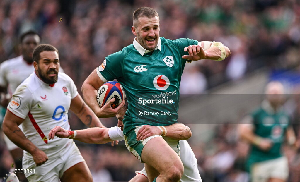 21 February 2026; Stuart McCloskey of Ireland is tackled by Freddie Steward of England during the Guinness 6 Nations Rugby Championship match between England and Ireland at the Allianz Stadium in Twickenham, England. Photo by Ramsey Cardy/Sportsfile