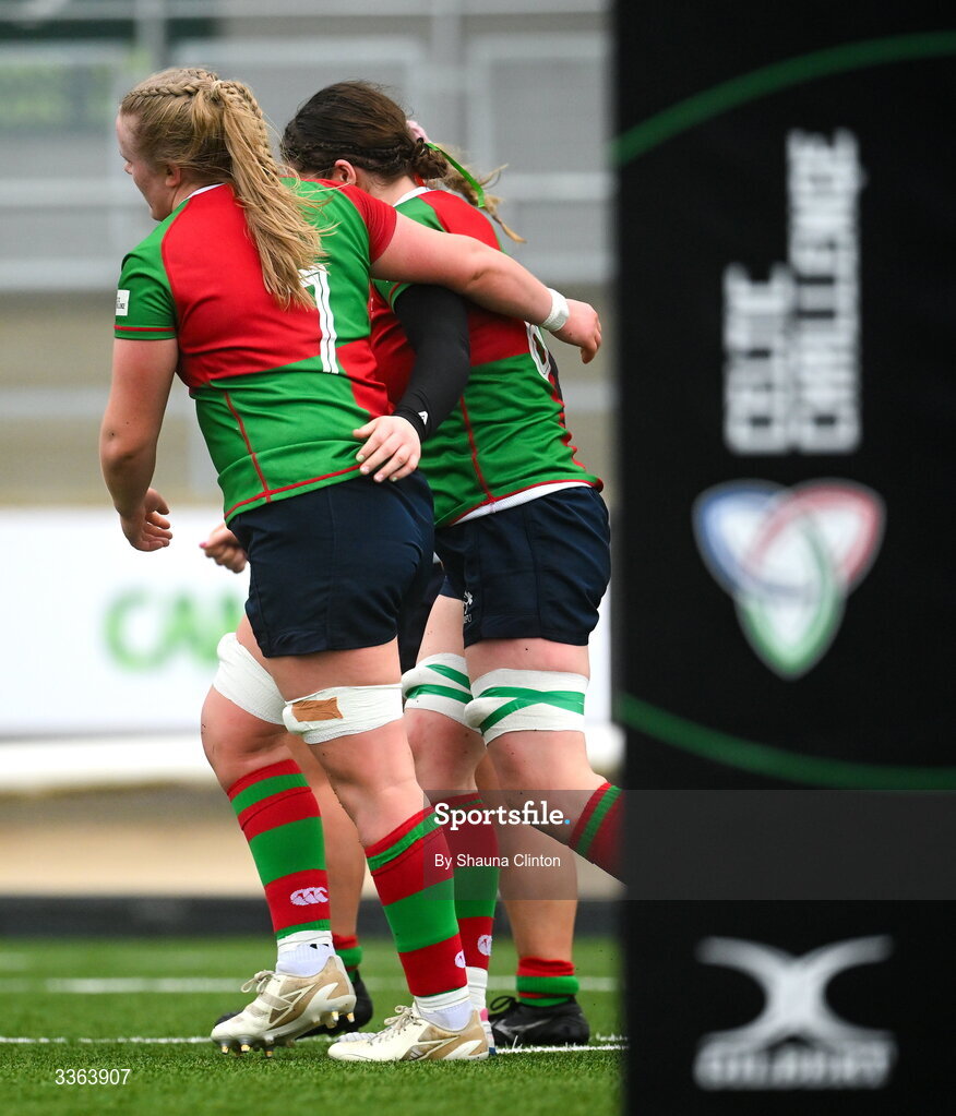 21 February 2026; Jemima Adams Verling of Clovers, right, is congratulated by team-mate Ailish Quinn, 7, after scoring their side's second try during the Celtic Challenge Round 8 match between Clovers and Edinburgh Rugby at Dexcom Stadium in Galway. Photo by Shauna Clinton/Sportsfile