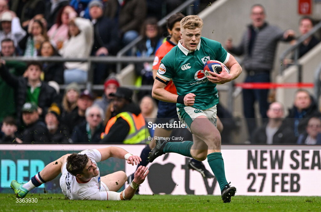 21 February 2026; Tommy O'Brien of Ireland on his way to scoring his side's third try during the Guinness 6 Nations Rugby Championship match between England and Ireland at the Allianz Stadium in Twickenham, England. Photo by Ramsey Cardy/Sportsfile