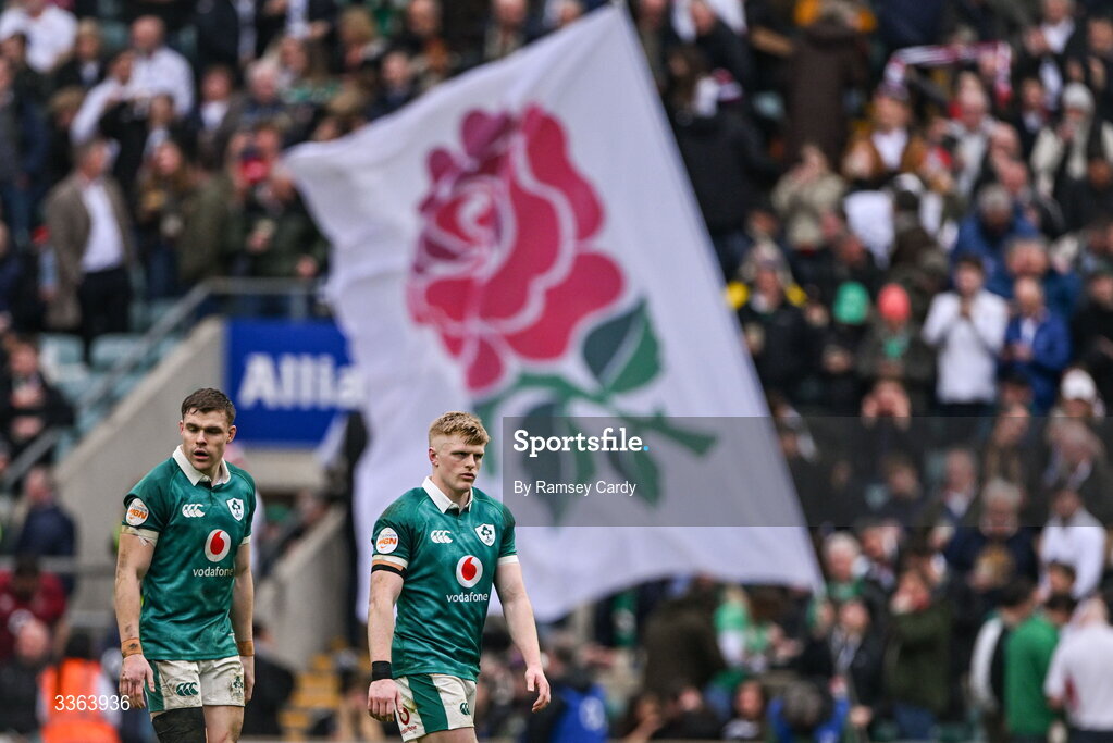 21 February 2026; Ireland players Garry Ringrose, left, and Tommy O'Brien during the Guinness 6 Nations Rugby Championship match between England and Ireland at the Allianz Stadium in Twickenham, England. Photo by Ramsey Cardy/Sportsfile