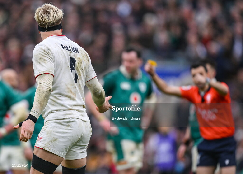 21 February 2026; Henry Pollock of England leaves the pitch after being shown a yellow card by referee Pierre Brousset during the Guinness 6 Nations Rugby Championship match between England and Ireland at the Allianz Stadium in Twickenham, England. Photo by Brendan Moran/Sportsfile