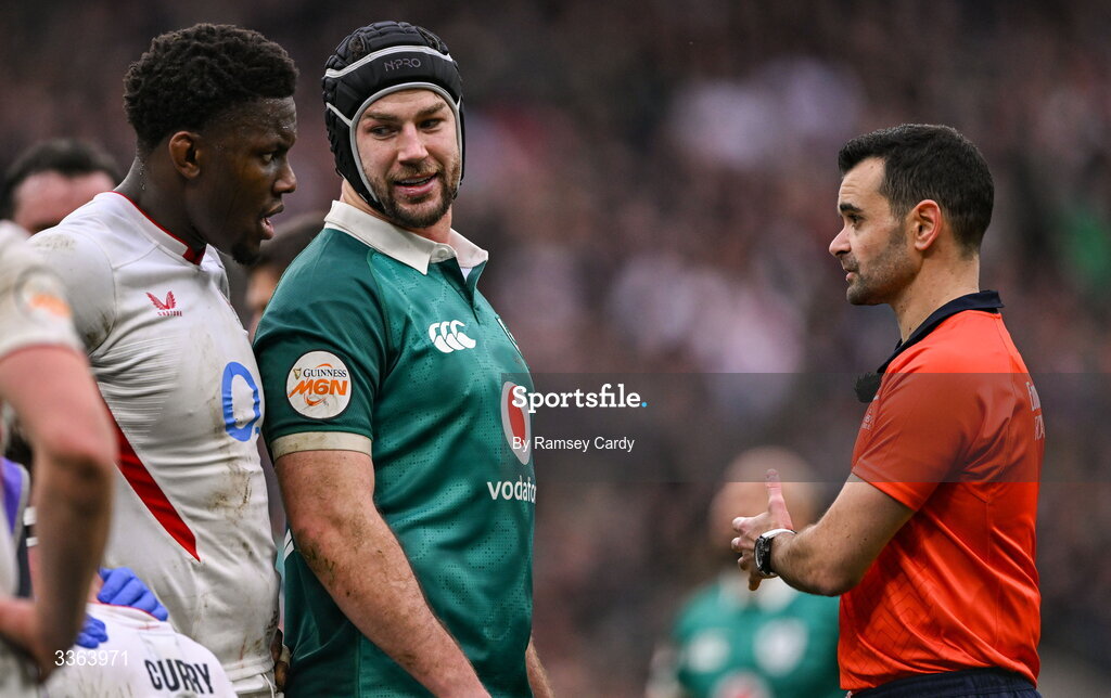 21 February 2026; Referee Pierre Brousset with Ireland captain Caelan Doris and England captain Maro Itoje during the Guinness 6 Nations Rugby Championship match between England and Ireland at the Allianz Stadium in Twickenham, England. Photo by Ramsey Cardy/Sportsfile