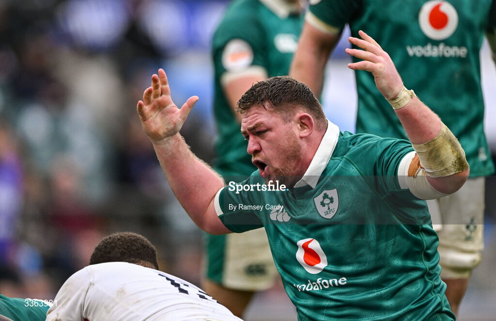 21 February 2026; Tadhg Furlong of Ireland reacts during the Guinness 6 Nations Rugby Championship match between England and Ireland at the Allianz Stadium in Twickenham, England. Photo by Ramsey Cardy/Sportsfile