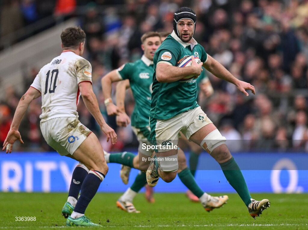 21 February 2026; Caelan Doris of Ireland in action against George Ford of England during the Guinness 6 Nations Rugby Championship match between England and Ireland at the Allianz Stadium in Twickenham, England. Photo by Brendan Moran/Sportsfile