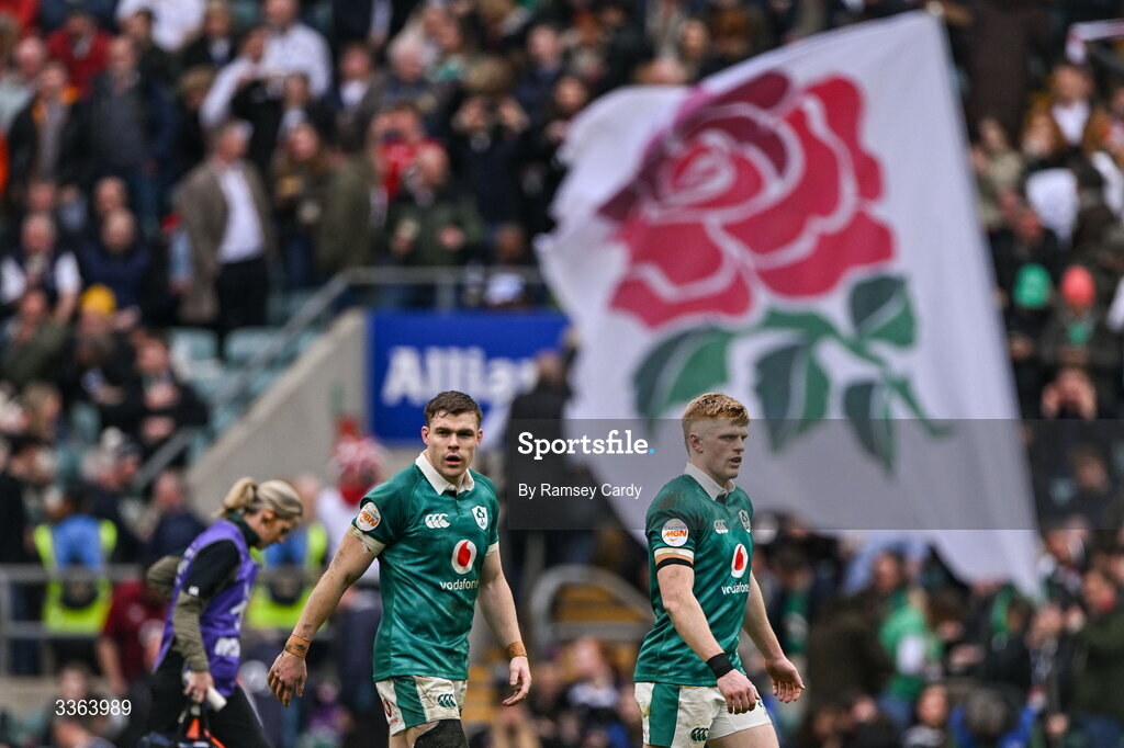 21 February 2026; Ireland players Garry Ringrose, left, and Tommy O'Brien during the Guinness 6 Nations Rugby Championship match between England and Ireland at the Allianz Stadium in Twickenham, England. Photo by Ramsey Cardy/Sportsfile
