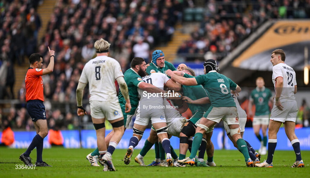 21 February 2026; Ireland players Tom O’Toole, Tadhg Beirne and teammates hold up England to win a scrum penalty during the Guinness 6 Nations Rugby Championship match between England and Ireland at the Allianz Stadium in Twickenham, England. Photo by Brendan Moran/Sportsfile