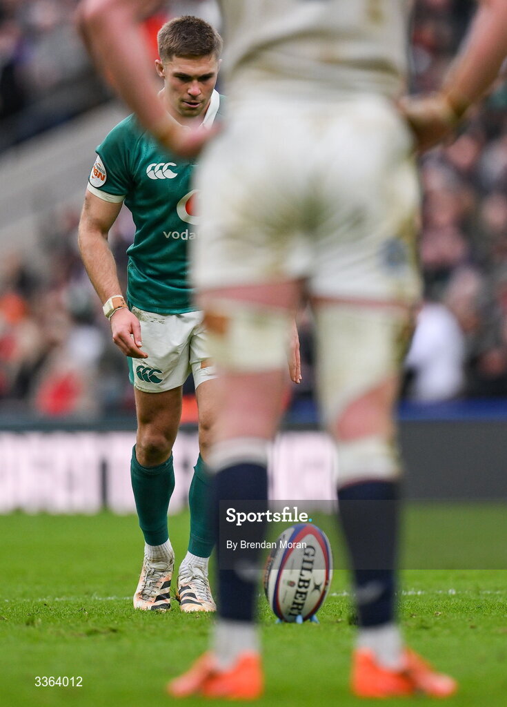 21 February 2026; Jack Crowley of Ireland prepares to kick a penalty during the Guinness 6 Nations Rugby Championship match between England and Ireland at the Allianz Stadium in Twickenham, England. Photo by Brendan Moran/Sportsfile