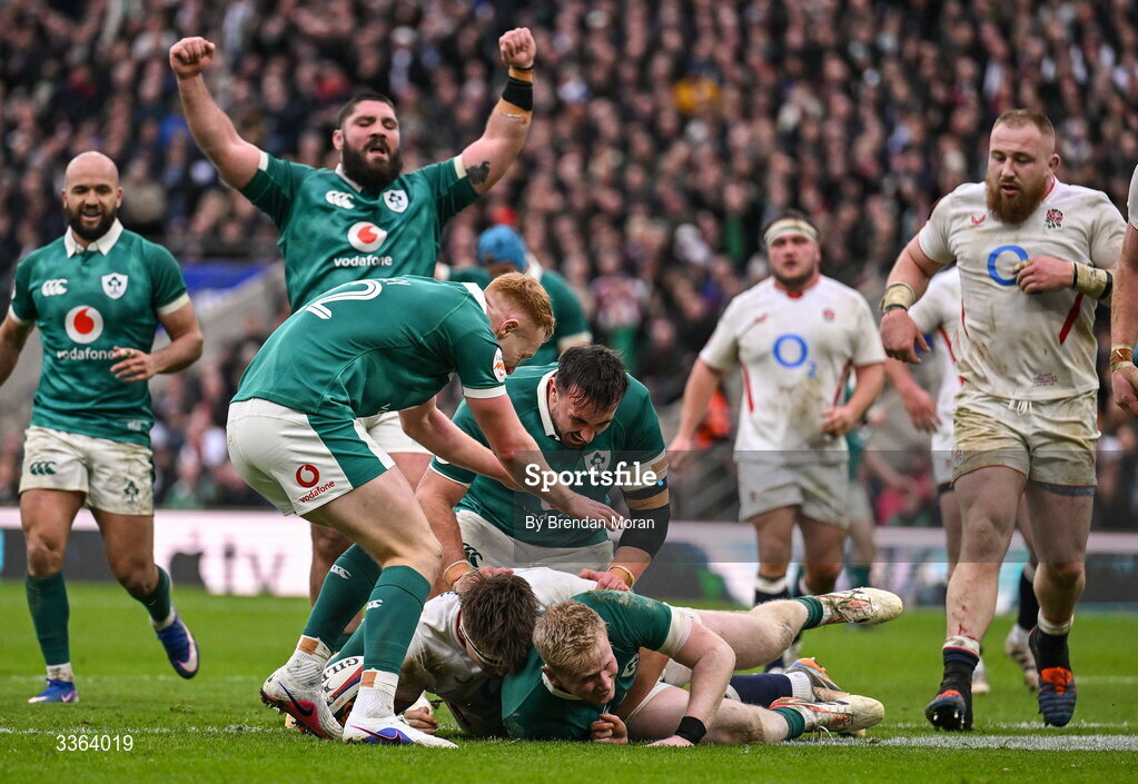 21 February 2026; Jamie Osborne of Ireland, bottom, after scoring his side's fifth try, as his teammates celebrate, during the Guinness 6 Nations Rugby Championship match between England and Ireland at the Allianz Stadium in Twickenham, England. Photo by Brendan Moran/Sportsfile