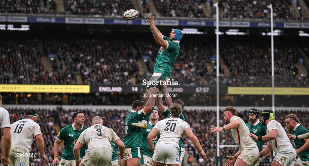 21 February 2026; Tadhg Beirne of Ireland takes possession in a lineout during the Guinness 6 Nations Rugby Championship match between England and Ireland at the Allianz Stadium in Twickenham, England. Photo by Brendan Moran/Sportsfile