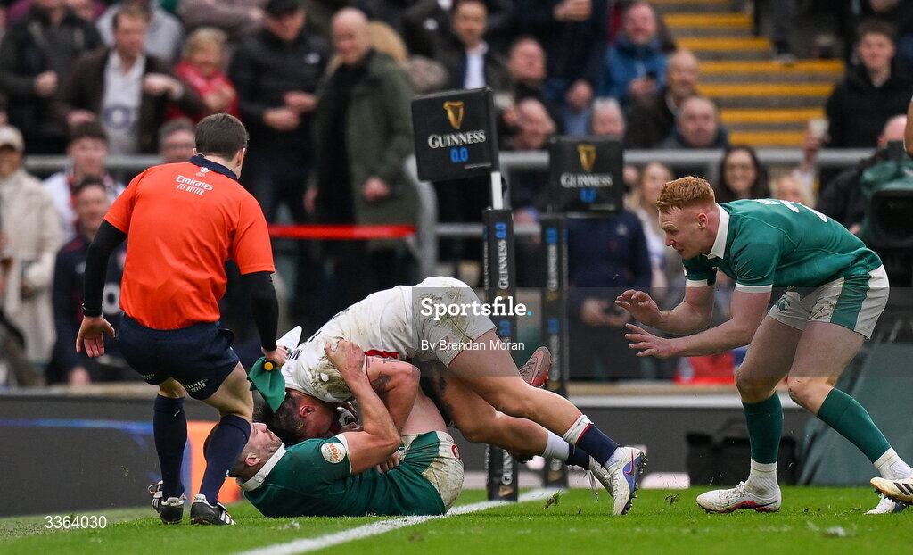 21 February 2026; Stuart McCloskey of Ireland drags England's Marcus Smith into touch during the Guinness 6 Nations Rugby Championship match between England and Ireland at the Allianz Stadium in Twickenham, England. Photo by Brendan Moran/Sportsfile