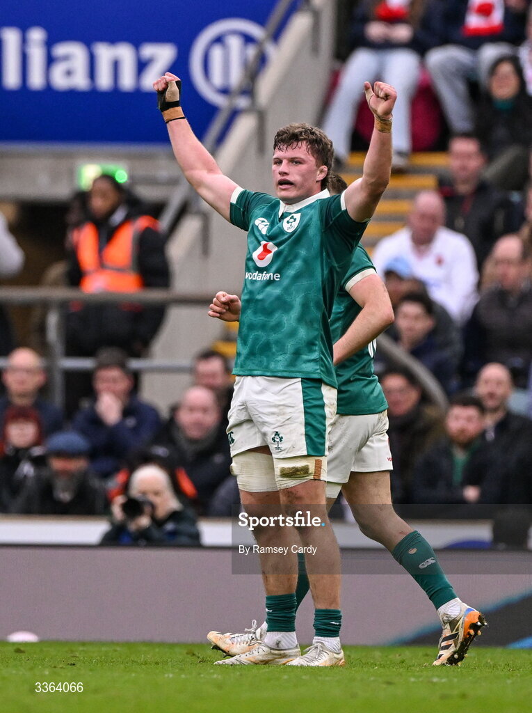 21 February 2026; Cian Prendergast of Ireland celebrates at the full time whistle during the Guinness 6 Nations Rugby Championship match between England and Ireland at the Allianz Stadium in Twickenham, England. Photo by Ramsey Cardy/Sportsfile