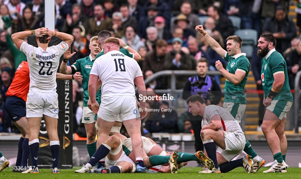 21 February 2026; Jack Crowley of Ireland, right, celebrates at the full-time whistle during the Guinness 6 Nations Rugby Championship match between England and Ireland at the Allianz Stadium in Twickenham, England. Photo by Ramsey Cardy/Sportsfile