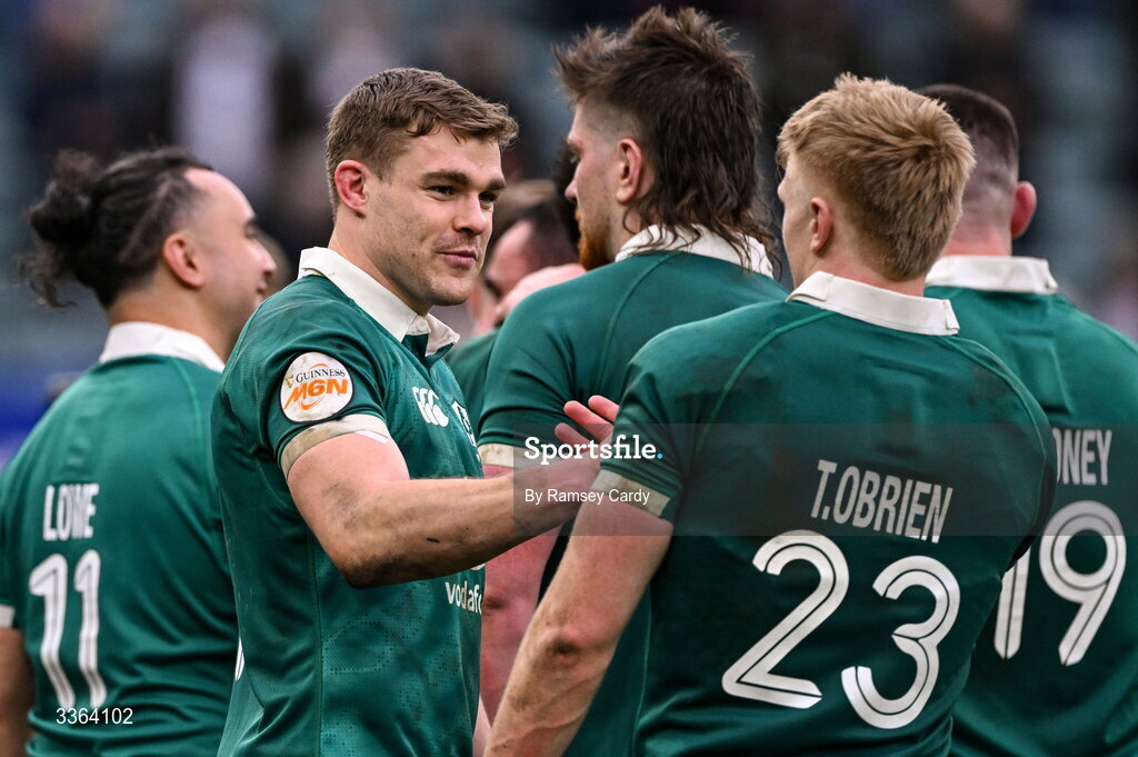 21 February 2026; Ireland players Garry Ringrose, left, and Tommy O'Brien after their side's victory in the Guinness 6 Nations Rugby Championship match between England and Ireland at the Allianz Stadium in Twickenham, England. Photo by Ramsey Cardy/Sportsfile