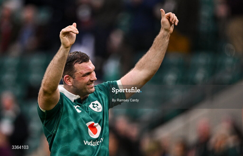 21 February 2026; Tadhg Beirne of Ireland celebrates after his side's victory in the Guinness 6 Nations Rugby Championship match between England and Ireland at the Allianz Stadium in Twickenham, England. Photo by Ramsey Cardy/Sportsfile