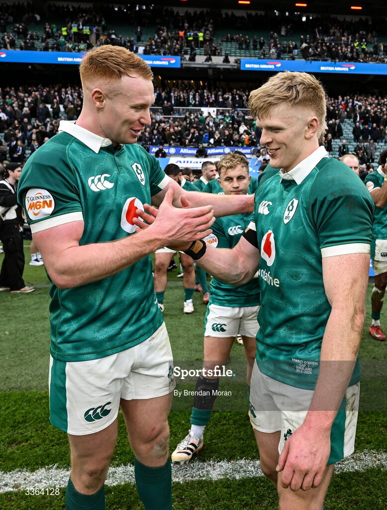 21 February 2026; Ireland players Ciarán Frawley, left, and Tommy O'Brien after their side's victory in the Guinness 6 Nations Rugby Championship match between England and Ireland at the Allianz Stadium in Twickenham, England. Photo by Brendan Moran/Sportsfile