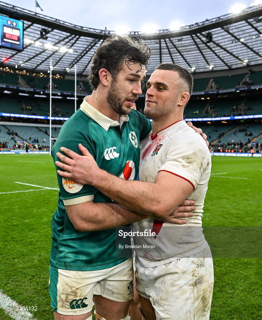 21 February 2026; Caelan Doris of Ireland and Ben Earl of England after the Guinness 6 Nations Rugby Championship match between England and Ireland at the Allianz Stadium in Twickenham, England. Photo by Brendan Moran/Sportsfile