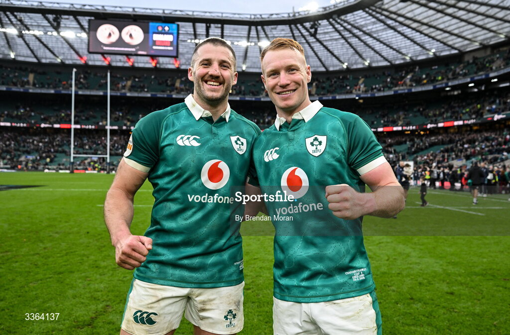 21 February 2026; Ireland players Stuart McCloskey, left, and Ciarán Frawley after their side's victory in the Guinness 6 Nations Rugby Championship match between England and Ireland at the Allianz Stadium in Twickenham, England. Photo by Brendan Moran/Sportsfile