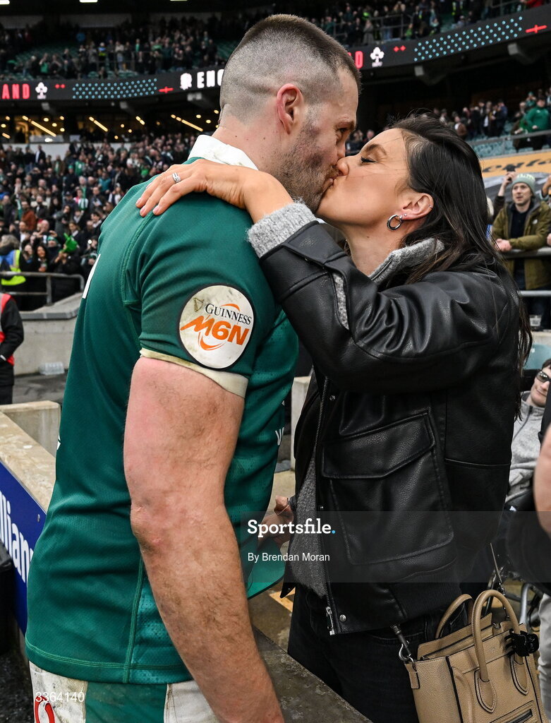 21 February 2026; Stuart McCloskey of Ireland with his wife Hannah after the Guinness 6 Nations Rugby Championship match between England and Ireland at the Allianz Stadium in Twickenham, England. Photo by Brendan Moran/Sportsfile