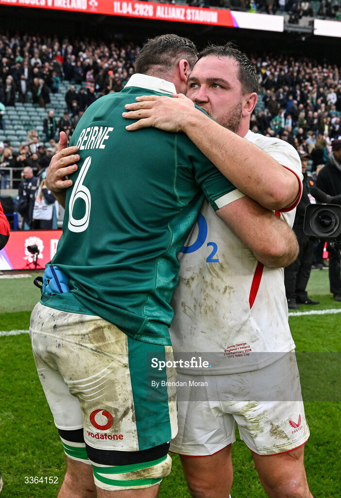 21 February 2026; Jamie George of England and Tadhg Beirne of Ireland after the Guinness 6 Nations Rugby Championship match between England and Ireland at the Allianz Stadium in Twickenham, England. Photo by Brendan Moran/Sportsfile