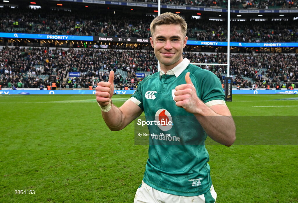 21 February 2026; Jack Crowley of Ireland after his side's victory in the Guinness 6 Nations Rugby Championship match between England and Ireland at the Allianz Stadium in Twickenham, England. Photo by Brendan Moran/Sportsfile