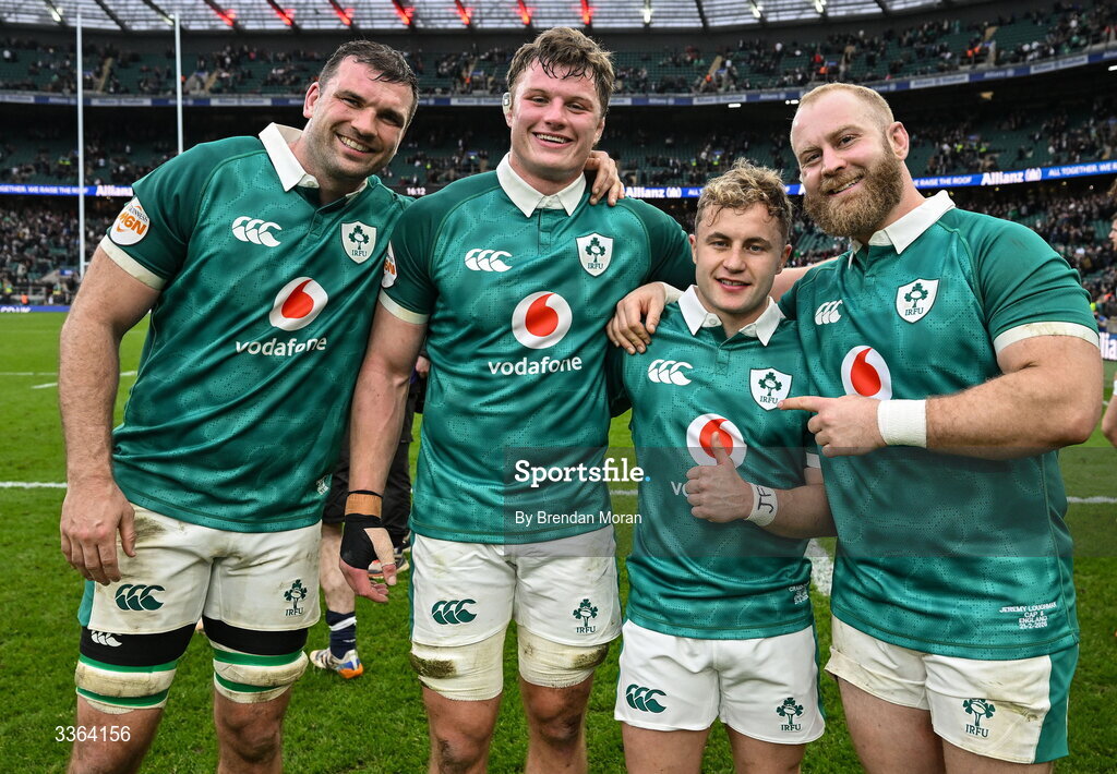 21 February 2026; Ireland players, from left, Tadhg Beirne, Cian Prendergast, Craig Casey, and Jeremy Loughman, after their side's victory in the Guinness 6 Nations Rugby Championship match between England and Ireland at the Allianz Stadium in Twickenham, England. Photo by Brendan Moran/Sportsfile