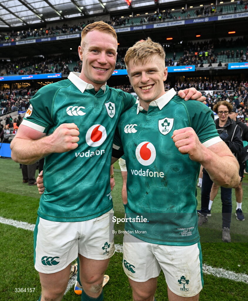 21 February 2026; Ireland players Ciarán Frawley, left, and Tommy O'Brien after their side's victory in the Guinness 6 Nations Rugby Championship match between England and Ireland at the Allianz Stadium in Twickenham, England. Photo by Brendan Moran/Sportsfile